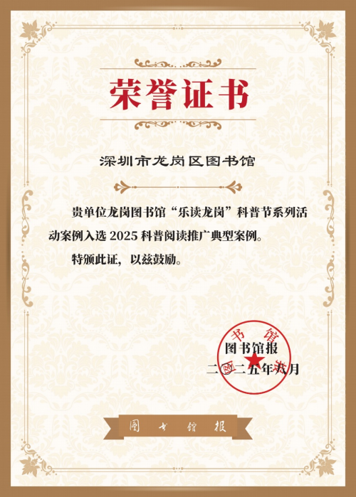 近日,由中国图书馆学会阅读推广工作委员会和北京市东城区文化和旅游局主办,北京市东城区图书馆和图书馆报社承办的2025科普阅读推广研讨会在北京召开。会议前期面向全国征集科普阅读推广典型案例,深圳市龙岗区图书馆“‘乐读龙岗’科普节系列活动” 以其在科普资源整合、活动形式创新、公众阅读引导等方面的亮眼实践,从210个案例中脱颖而出,赢得评审专家的一致认可,获评“全国优秀案例”,为全国科普阅读推广工作提供了可借鉴的 “龙岗经验”。