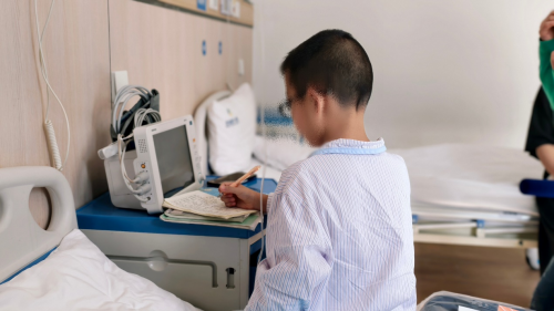 针对孩子的情况,润城普瑞眼科医院视光与小儿眼病专家团队会诊后决定实施后巩膜加固术。该手术的核心原理是通过植入生物材料,机械性加固眼球后部变薄的巩膜,限制眼轴进一步拉长,从而降低眼底并发症风险、稳定视力。“乐乐目前左眼眼轴已达29.15mm,此次手术的目标是将眼轴增长速度控制在合理范围内。” 侯主任表示。 对于乐乐小小年纪就高度近视,家人十分困惑。乐乐爸爸和哥哥均为低度近视,妈妈视力也很好,为何孩子会发展成高度近视?侯主任解释,病理性近视的病因可能与基因、其他疾病有关,但目前主要病因尚未明确,早期排查和干预尤为关键。 暖心护航手术路,术后护理需谨慎 手术前,普瑞眼科儿童眼病专家岳以英教授特地赶来探望乐乐,为他送来书包、书籍等学习用品,还给小朋友加油鼓劲缓解紧张情绪,岳教授细致地询问了乐乐的过敏原及生活习惯,反复嘱咐护士关注孩子餐食的营养搭配,让乐乐和家长倍感温暖。