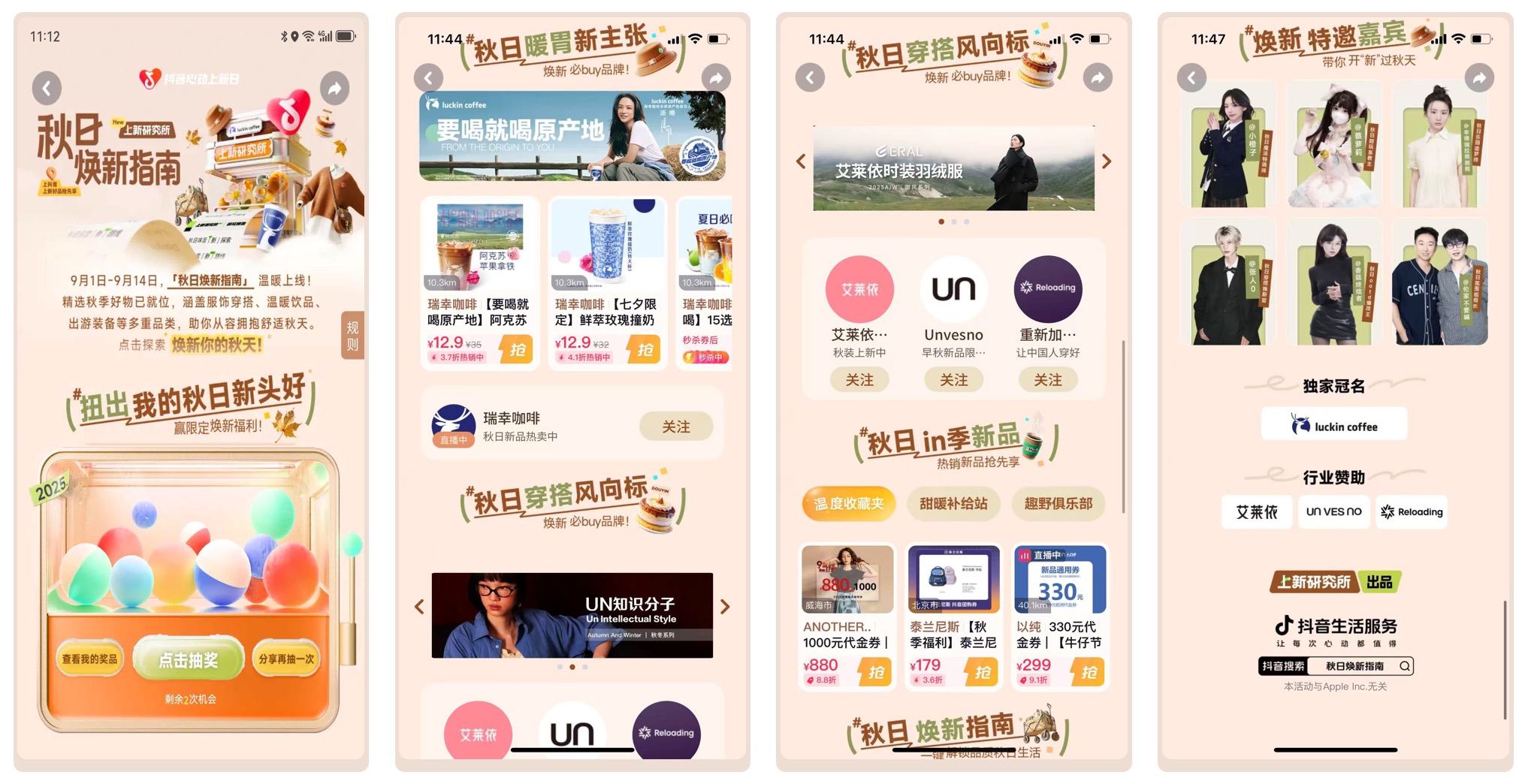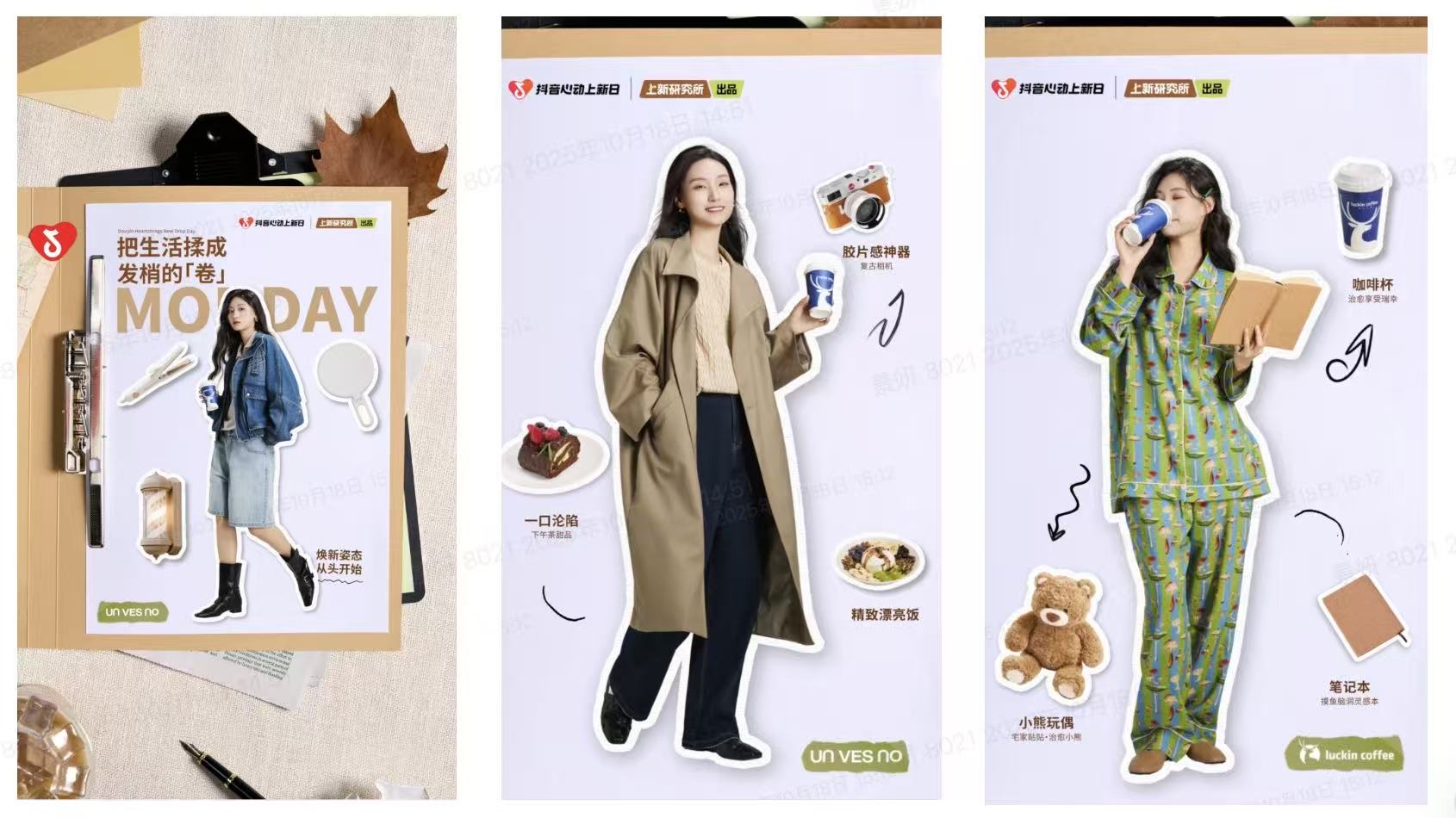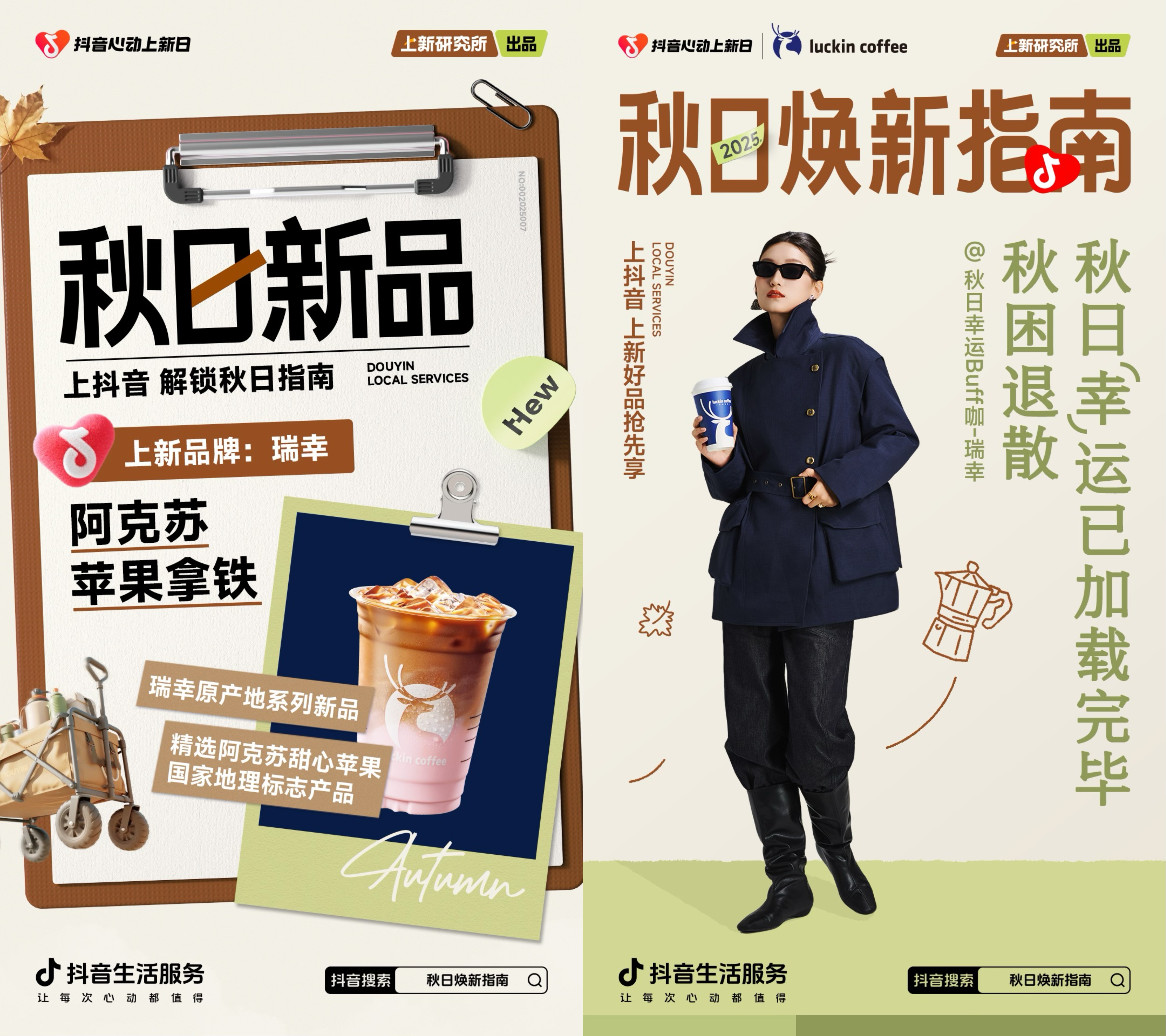 2. 内容玩法:多元内容形态构建品牌记忆矩阵 为将“原产地价值”生动传递给消费者,瑞幸携手「抖音心动上新日|上新研究所」打造了一套立体化的内容传播体系,通过多维度、多形态的内容布局,实现了从品牌认知到情感共鸣的深度沟通。 首先,品牌联合IP通过定制化的视觉形象抢占用户心智,以温暖秋日色调为主、充满治愈感的品牌海报与新品视觉,强化了瑞幸“秋季饮品顶流”的整体形象,将阿克苏苹果拿铁的产品特色清晰直观地呈现在用户面前。在此基础上,品牌坚持“先场景,后产品”的沟通逻辑,借助创意贴片与短视频内容,将新品自然融入多个生活场景,让产品价值转化为用户可感知的生活灵感,有效激发了情感共鸣与尝新欲望。