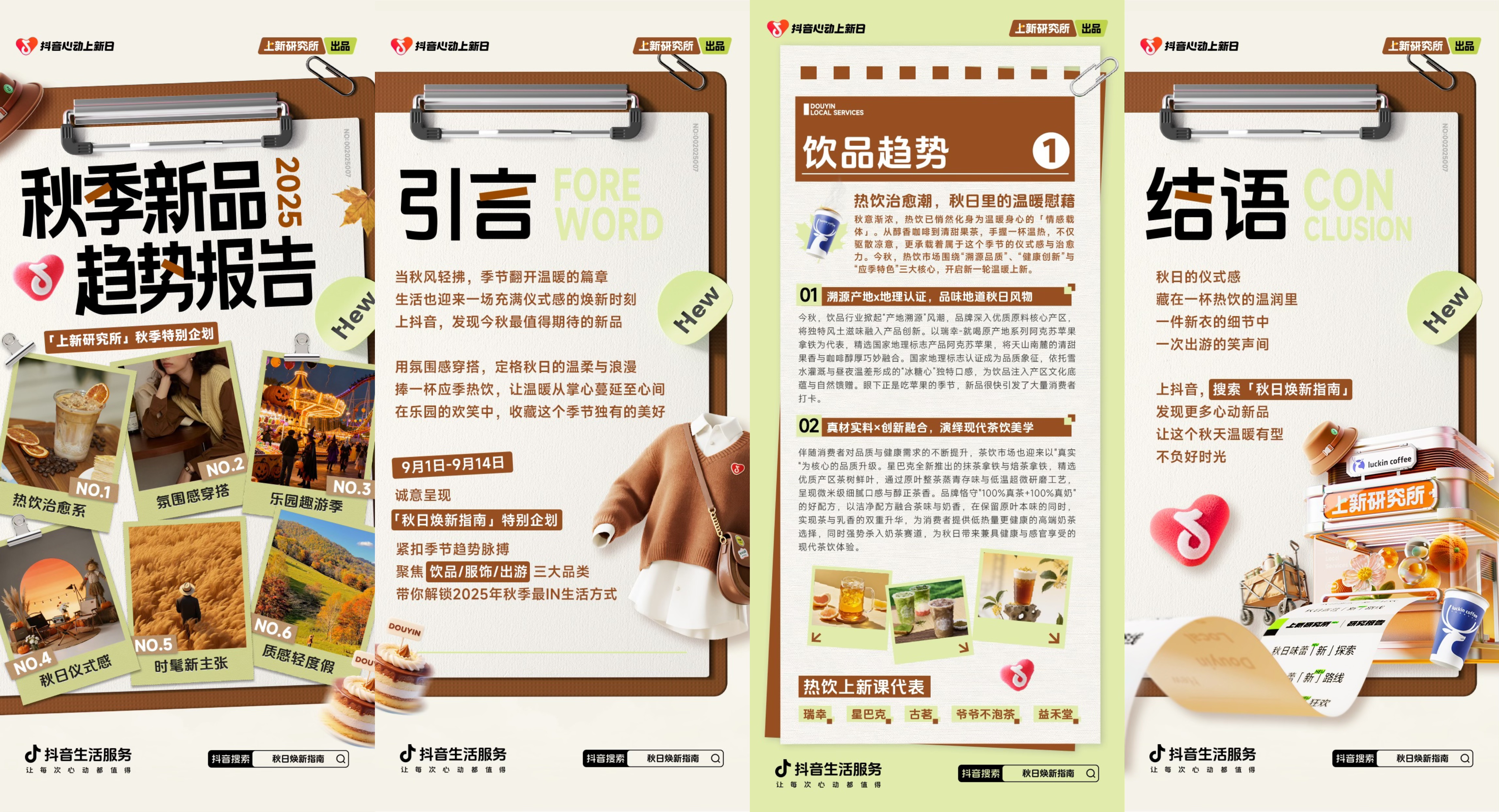 此外,品牌还深度植入了「抖音心动上新日|上新研究所」的《秋季新品趋势报告》,聚焦秋季饮品赛道,以前瞻视角解读饮品消费动向与生活方式变迁。报告中瑞幸作为行业风向标,不仅获得了平台的权威背书,也在用户心智中成功抢占“秋日暖饮首选”的认知高地,进一步提升了品牌的行业影响力与专业形象。