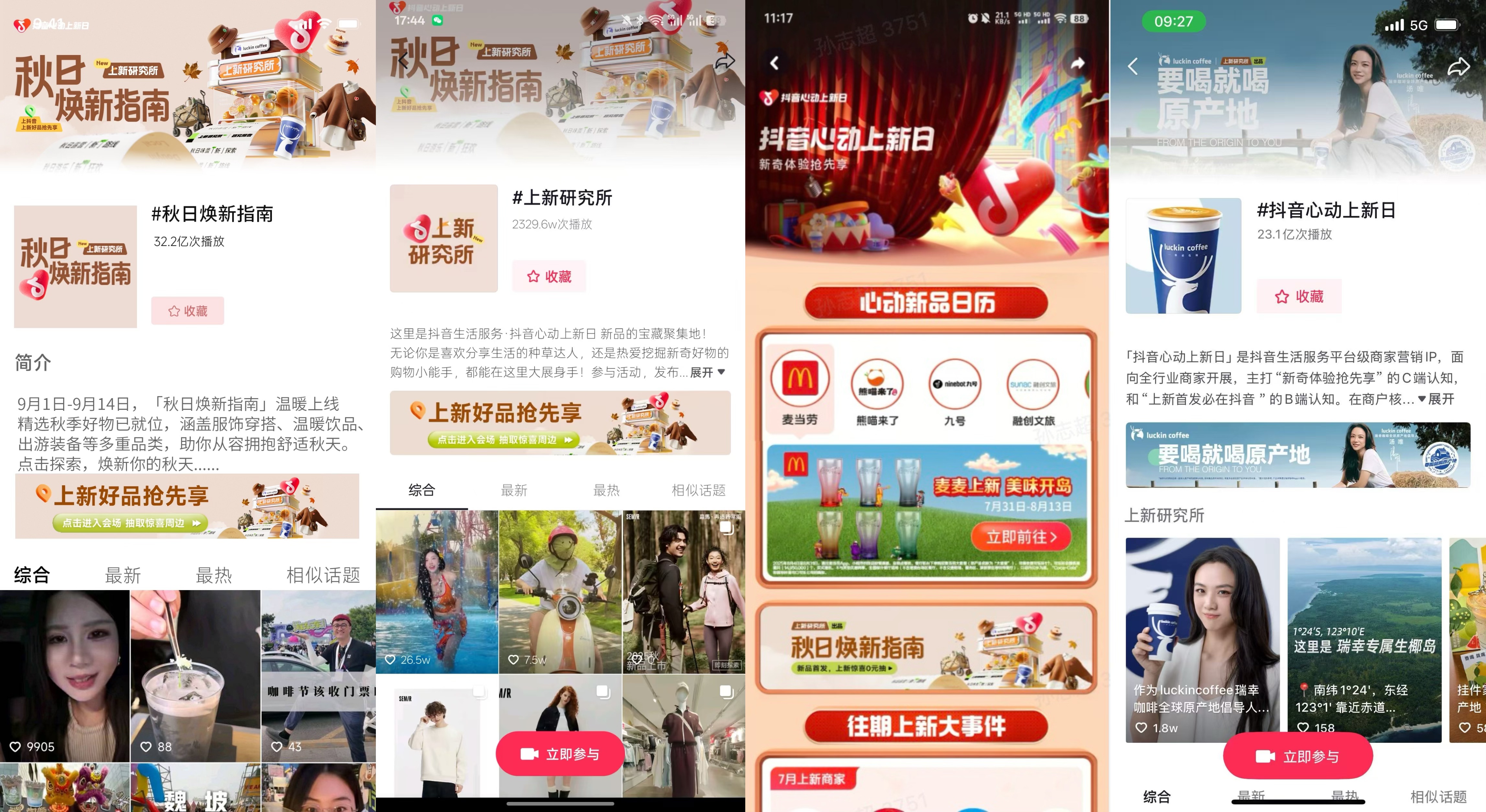 3. 全域宣发:线上线下联动,打造营销闭环 为确保传播效果最大化,瑞幸深度整合「抖音心动上新日|上新研究所」的站内与站外资源,构建了一套全方位、立体化的传播矩阵,实现了对目标用户的多场景包围与高频触达。 抖音站内, 瑞幸系统化布局抖音核心资源位,形成多点开花的引流态势:通过品牌开屏强势抢占用户第一视线,实现活动信息的广泛告知;借助直播间专属指示器与热点话题聚合页,将自然流量高效转化为品牌活动流量,形成持续加热;配合主话题融入与搜索彩蛋等轻互动玩法,显著提升用户参与感与停留时长。多资源联动下,撬动6亿用户的生态势能,为新品爆发构筑了坚实的流量基础。