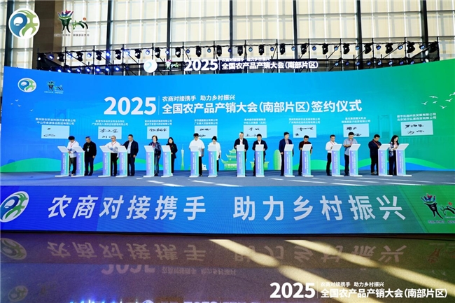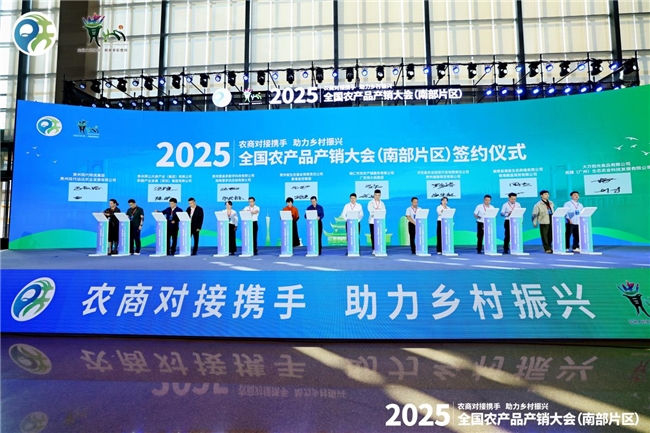 签约仪式 发言环节结束后,大会举行了2025年全国农产品产销大会(南部片区)项目签约仪式。贵州省供销管理集团、贵州弥创农业科技开发有限公司、贵州苗侗医药集团有限公司等16家贵州优质农产品供应商与重庆万草堂药材有限公司、广东农品入湾供应链管理有限公司、珠海菜篮子投资有限公司等16家省外采购商现场签订贵州农产品采购合约,有效提振了参会参展企业产销对接合作的信心。