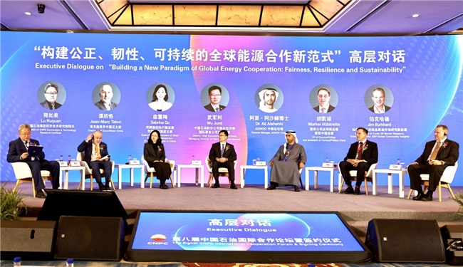 第八届中国石油国际合作论坛高层对话。金添摄 论坛还举办了高层对话环节,中国石油与来自壳牌集团、埃克森美孚、康菲、阿布扎比国家石油公司、标普全球等全球顶尖能源企业的领军者与资深业界专家,围绕“能源公正转型”“能源供应链韧性”“能源发展新动能”三大议题,通过开放的数据、丰富的案例和思想的碰撞,凝聚智慧与共识,谋求为全球能源合作的新范式找到最大公约数。