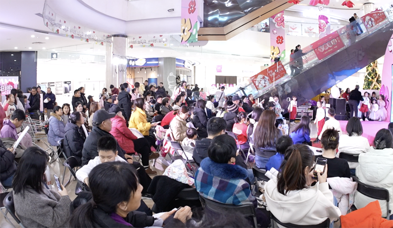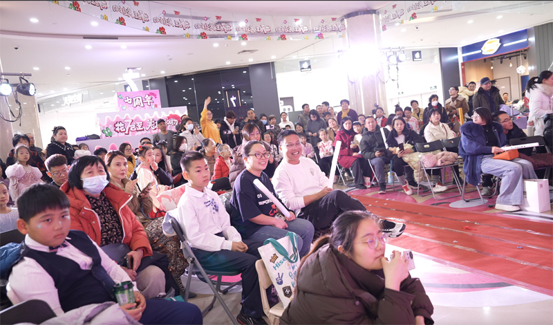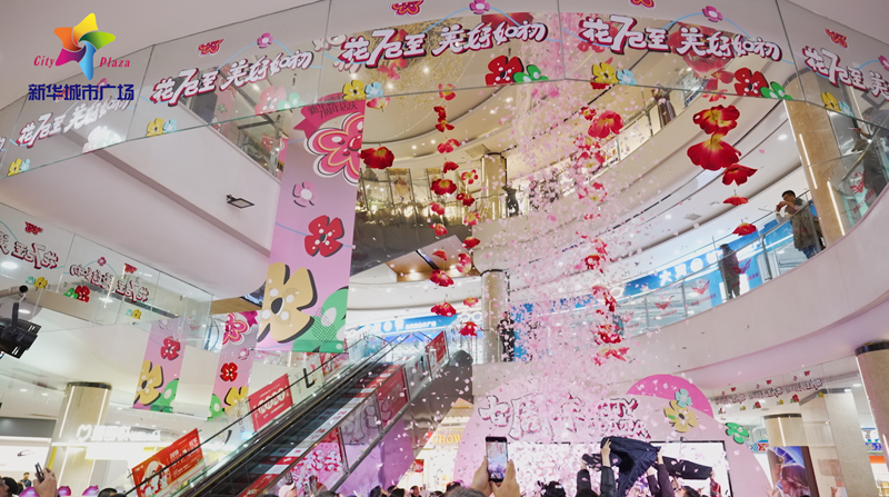 与许多项目将周年庆视为促销节点不同,新华城市广场此次将店庆定义为“项目调改的预热事件”。 在“新思路,再出发”的核心理念下,店庆以 “花”为视觉与情感主线,通过“冬日津南唯一开花的地方”这一极具反差感的定位,打造一系列打卡场景: 室内“开花立柱”与“走花路”地贴,营造沉浸式行进体验; “共沐花雨”仪式与千人蛋糕分享,强化活动的仪式感与参与感。 这些场景不仅为拍照传播服务,更在向市场传递明确信号:新华城市广场正在变美、变暖、变有趣。新华城市广场也借此次店庆,将“亲子家庭+社区友好”的长期标签,以更轻盈、更年轻的方式呈现出来。 从“促销”到“经营”:为商户赋能,为调改蓄力