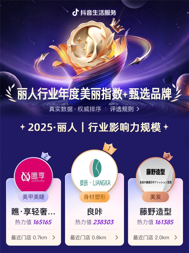 摘要:抖音生活服务丽人美丽指数揭晓,标杆品牌赋能美丽生态 近日,抖音生活服务2025年度丽人行业年度美丽指数·甄选品牌正式揭晓。此次甄选汇集全行业优质丽人品牌,其中18家品牌凭借长期主义经营实践与卓越服务品质脱颖而出,斩获各类专项奖项,荣登获奖名单。此次获奖不仅是对这18家品牌自身实力的肯定,更是其与美丽指数“真实数据+专业标准”核心体系深度契合的生动体现,作为年度美丽指数认证的突出标杆,它们将以品质为帆,与其他优质品牌共同引领丽人行业迈向“品质优先、长期价值”的发展新阶段。