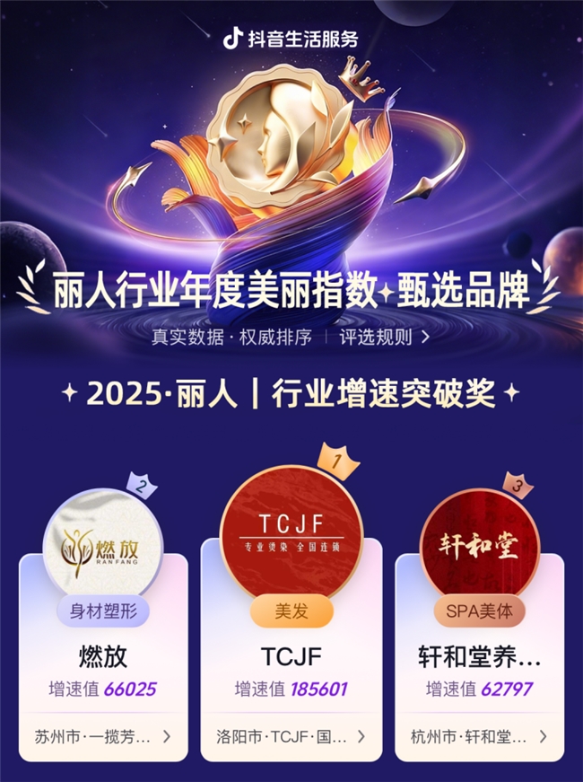 2025·丽人|行业增速突破奖则聚焦品牌增速与品牌增长潜力,重点发掘那些凭借差异化服务、精准用户定位与高效运营模式,实现快速成长、为行业注入新鲜活力的新兴势力品牌。 •TCJF-美发: 烫染新主张,美发不重样。TC美发,专业烫染!凭借精准的烫染细分定位与差异化服务理念,快速占领市场认知,以专业技术打造个性化造型,成为美发赛道快速崛起的新兴势力 • 燃放-身材塑形: 化茧成蝶,燃放美丽,让百万女性不惧身材困扰!精准洞察女性身材管理需求,以情感共鸣+专业服务的模式快速积累用户,实现规模与口碑双增长 • 轩和堂养生馆-SPA美体: 轩和堂流量新实体,点亮一座城市的美。以创新的流量运营模式赋能实体门店,精准链接本地美容需求用户,凭借特色SPA美体服务快速打开区域市场,激活本地美业活力