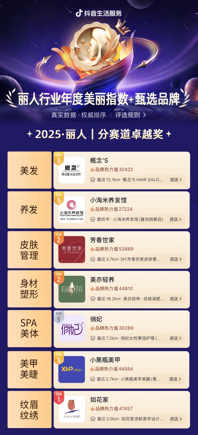 02「垂直深耕:7大分赛道勾勒品质服务全景图」 2025·丽人|分赛道卓越奖获奖品牌,分别覆盖美发、养发、美甲美睫、纹眉纹绣、皮肤管理、身材塑形、SPA美体七大细分品类,成为各垂直领域品质服务的具象代言,精准印证了抖音生活服务丽人行业“全品类覆盖、精准匹配需求”的价值主张。 7家品牌的垂直深耕实践,不仅让细分赛道价值得以凸显,更为全行业中小商户提供了可复制的成长范本,证明在细分领域坚守品质、精准匹配用户需求,就能实现差异化发展。 • 概念`s-美发: 国民理发店,好形象,选概念,更懂你!凭借国民级品牌认知,精准洞察大众审美需求,以亲民定位与专业服务,成为全年龄段用户信赖的美发选择 • 小淘米养发馆-养发: 防脱发有头屑就用古方小淘米,聚焦脱发、头屑等核心头皮问题,依托古方养护理念打造专属产品,精准解决用户头皮困扰 • 小黑瓶美甲-美甲美睫: 做美甲,指定小黑瓶,以强品牌辨识度建立用户认知,专注优质美甲服务与时尚款式打造,成为美甲需求的优选品牌 • 如花家-纹眉纹绣: 如花家,专注于纹眉行业,抖音纹眉赛道TOP1,凭借专业纹眉技术与精准赛道定位,依托线上流量优势实现口碑沉淀,引领纹眉行业标准化发展 • 芳香世家-皮肤管理: 芳香世家,家门口的皮肤管理,以社区化布局打造便捷服务场景,依托科学护肤理念为用户提供精准皮肤护理方案 • 美亦轻养-身材塑形: 美亦轻养,您身边的体形+健康管理师,聚焦体形管理与健康养护双重需求,以贴身服务模式为用户定制个性化方案 • 俏妃-SPA美体: 俏妃女性身体护理全国4000+连锁门店,肩痛、经痛、腰背痛,俏妃拔湿灸有用!凭借全国规模化连锁布局,专注女性身体护理痛点,以特色拔湿灸服务构建核心竞争力