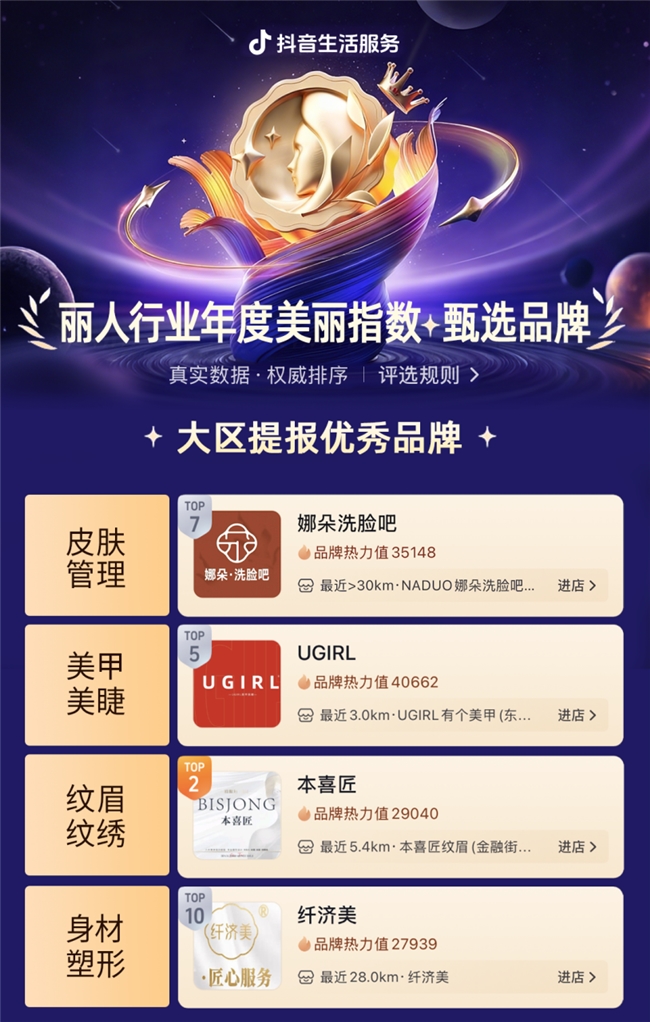 对行业而言,这些品牌用实力证明“品质=增长”,倒逼全行业告别“价格战”“套路营销”的内卷乱象,转向“价值战”“口碑战”的良性竞争,同时带动更多商户关注服务合规性与流程规范性,加速行业“良币驱逐劣币”进程。 此次丽人行业年度美丽指数·甄选品牌的揭晓,并非行业品质升级的终点,而是新的起点。18家获奖品牌不是孤立的标杆,而是推动行业进步的“同行者”。未来,丽人美丽指数·甄选品牌将持续以真实数据为核心,以专业标准为导向,与更多优质品牌携手,推动丽人行业向更专业、更透明、更具价值的方向发展。 目前,抖音生活服务丽人行业年度美丽指数·甄选品牌的完整名单已正式公布,用户可通过以下路径,解锁获奖品牌详情,精准链接优质丽人服务,开启全品类放心变美之旅。