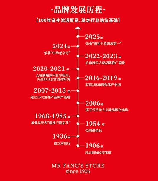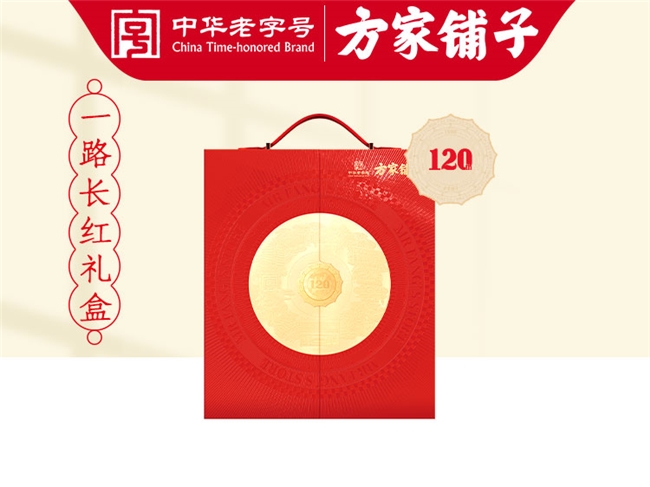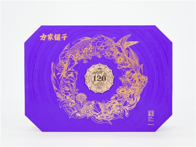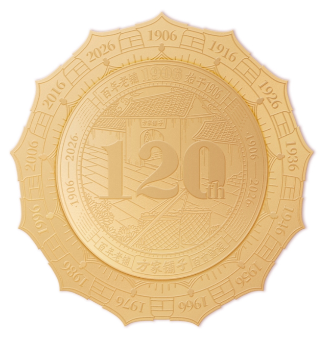 (方家铺子百年底蕴) 120周年专属徽章,敬献时代之礼 作为120周年的重要身份标识,本次典藏礼盒的设计,是方家铺子120年故事与精神的视觉浓缩,每一处细节都蕴藏着品牌的巧思与深意。 贯穿全系列的“120周年专属徽章”,正是这一设计的灵魂所在。徽章整体以“品牌根源—传承脉络—时光沉淀”为叙事主线,并通过“场景—文字—时间”的递进结构,将方家铺子的起源故事、百年传承与时代跨度层层展开,成为兼具纪念意义与象征价值的周年标识。