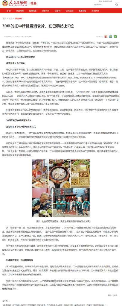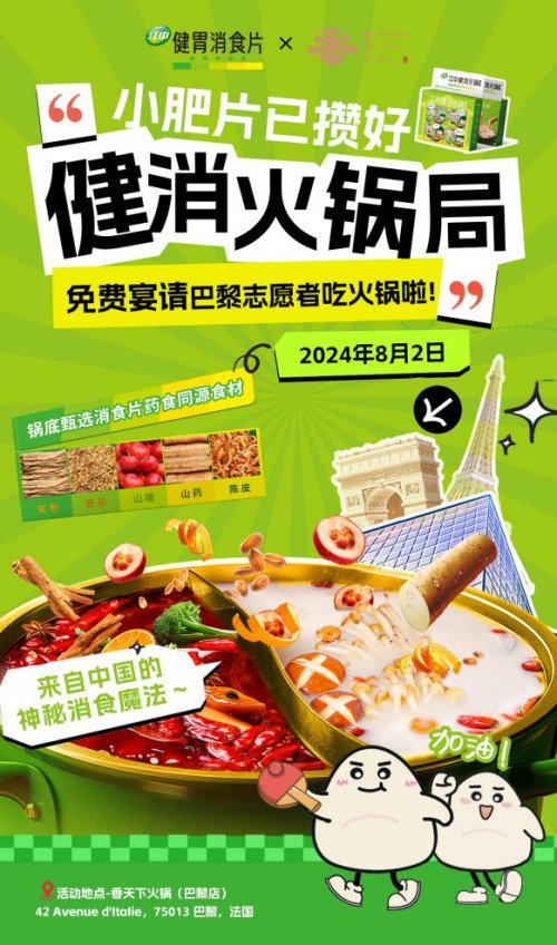 2024年巴黎奥运会期间,江中牌健胃消食片以30周年为契机,巧妙借势奥运热点,策划了一场轻线下、重传播的海外社会化营销事件。项目围绕“消食火锅”的创意载体,打造“江中消食火锅火爆巴黎”的核心话题词,通过真实场景与文化共鸣,实现中医药文化出海与品牌声量的提升。
